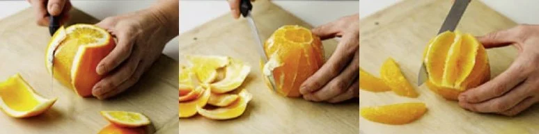 Slice off the ends of the orange to get the flesh barely exposed, lay it down on one of the cut surfaces, then insert the knife blade into the space between the flesh and the skin at an angle and with a sawing motion, follow the contour of the orange. Remove just enough skin and pith to expose the flesh underneath and